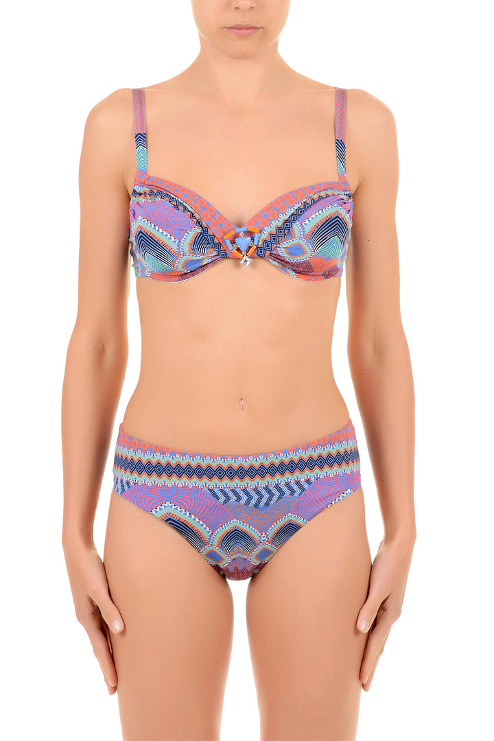 Questo bikini unisce eleganza e praticità grazie al classico slip abbinato a un top impreziosito da un raffinato gioiello. Le spalline regolabili garantiscono una vestibilità personalizzata, mentre la fantasia selezionata dona un tocco distintivo, ideale per chi cerca stile e comfort in ogni occasione.