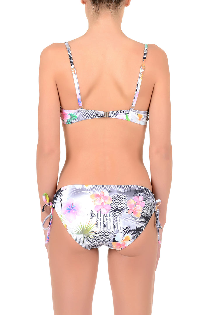 This underwire bikini offers support and comfort thanks to its structured design and adjustable straps, which allow a customized fit. The model includes a matching slip with elegant bows, characterized by an animalier pattern that gives a touch of bold and contemporary style. Ideal for those looking for a functional yet refined beachwear piece.