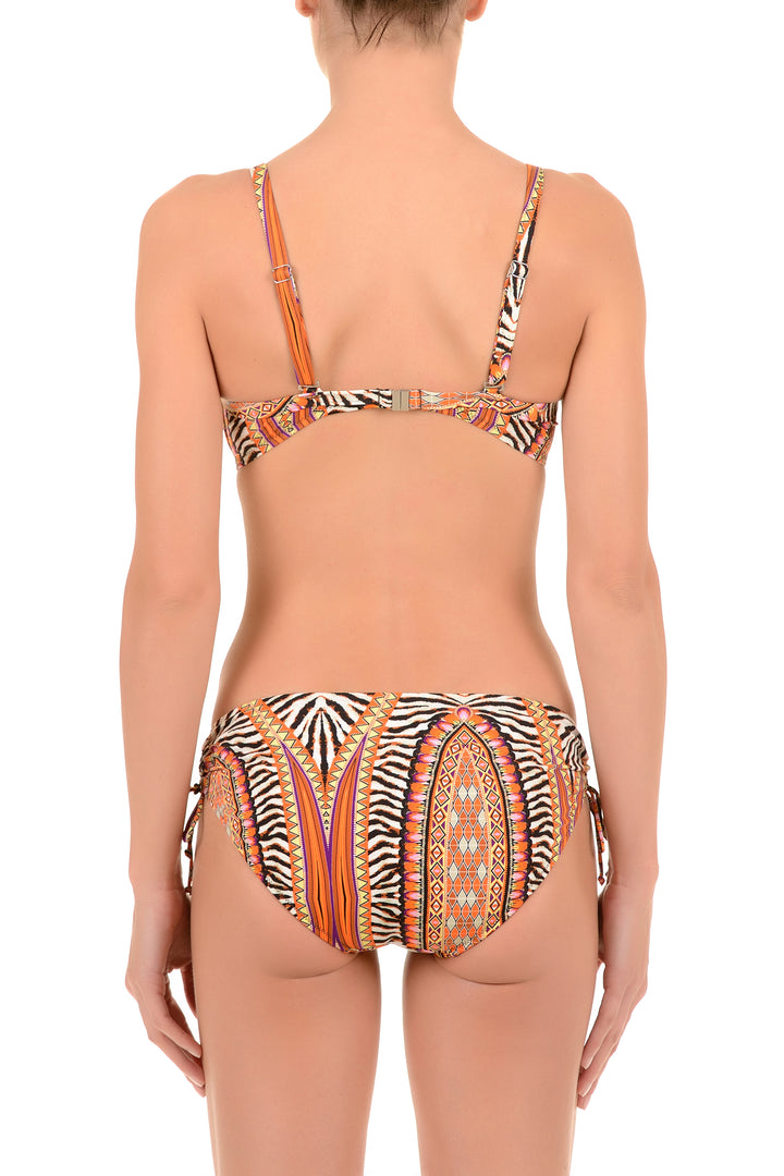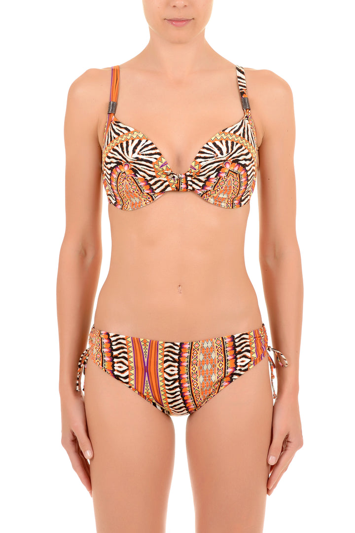 This underwire bikini combines style and support, ideal for those seeking comfort without sacrificing elegance. The adjustable straps allow a personalized fit, while the coordinated bottoms with bows add a feminine and refined touch. The animal print pattern gives a bold character, perfect for those who want to stand out with class during beach or pool days.