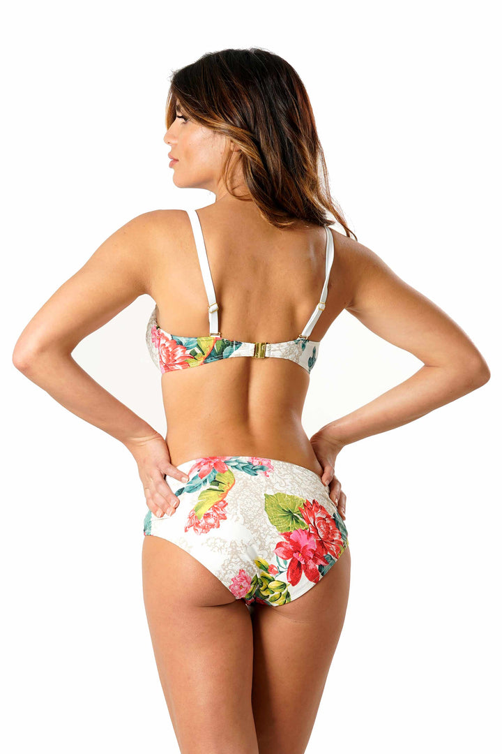 The underwire bikini is perfect for those who want support without the rigidity of cups. The top features a slight crossed draping that creates a sweetheart neckline. The side-closed bottoms ensure excellent coverage.