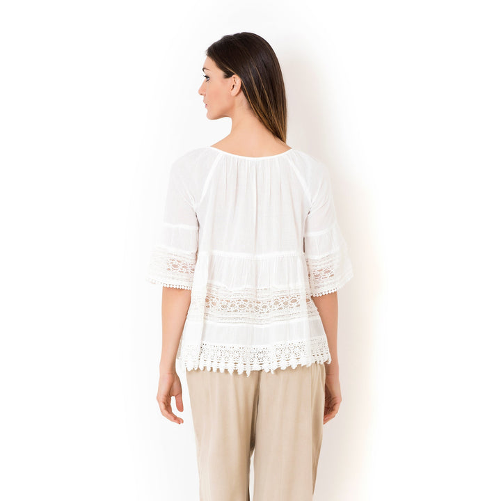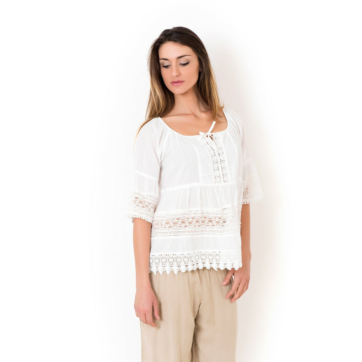 This elegant white blouse features delicate lace details that enhance its refined style. A versatile piece suitable for both formal occasions and a fashionable everyday look. The breathable fabric ensures comfort while maintaining a polished appearance.