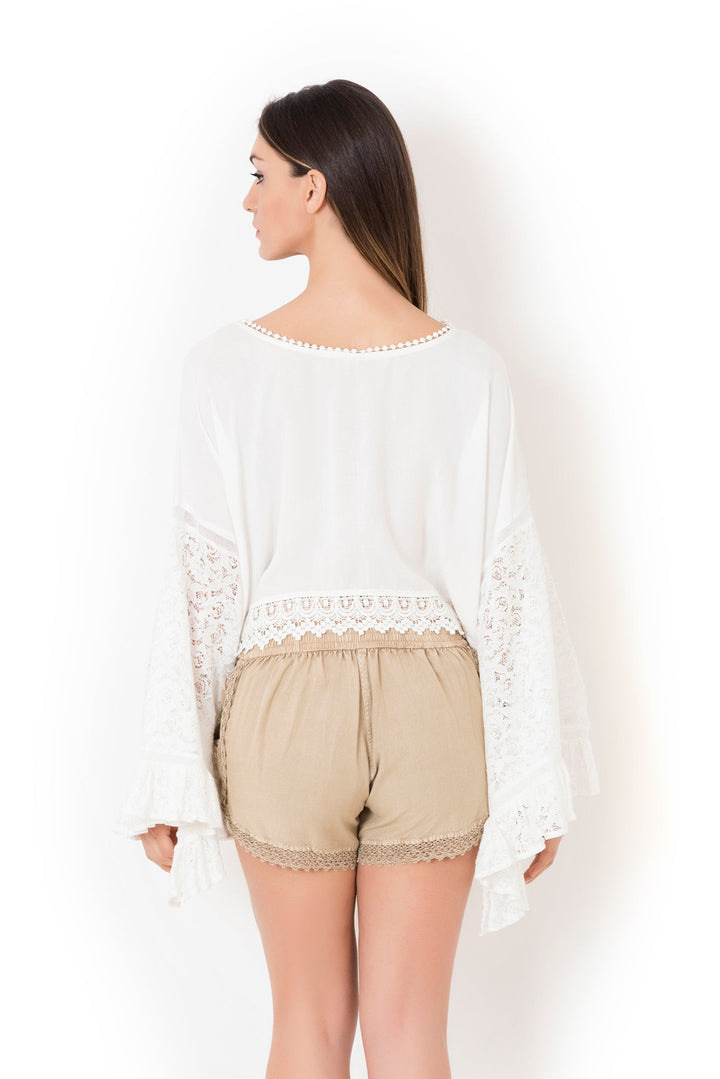 This crop blouse features elegant batwing sleeves decorated with delicate lace embroidery. The lightweight and breathable fabric offers both comfort and style, making it a versatile piece for refined casual looks or elegant evenings. The intricate lace details add a sophisticated touch, enhancing your outfit with subtle femininity.