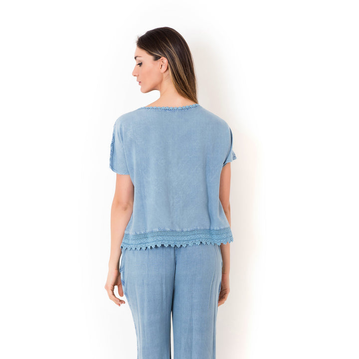 This elegant blouse features a V-neckline and delicate embroidered details, combining sophistication with subtle artistry. Perfect for enhancing both casual and formal looks, it offers a refined touch that enriches your wardrobe with timeless style and expert craftsmanship.