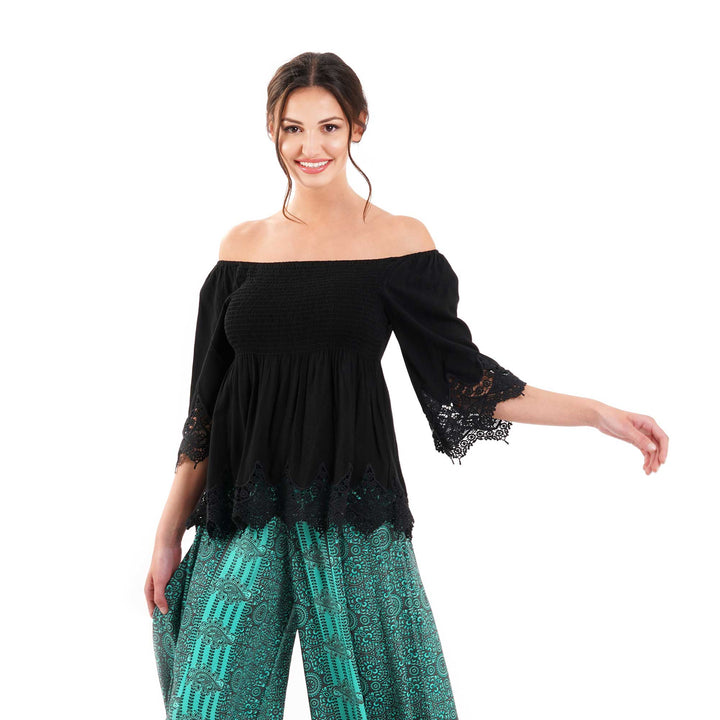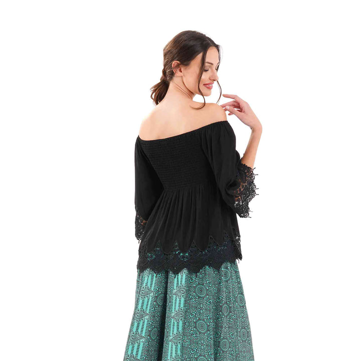 This elegant blouse with a boat neckline gently frames the shoulders, perfect for a sophisticated and versatile look. The elastic bust ensures a comfortable and snug fit, while the lace embroidery adds a touch of refinement and femininity. An ideal garment for those seeking quality and style without compromise, easily paired with your favorite pieces from the collection.