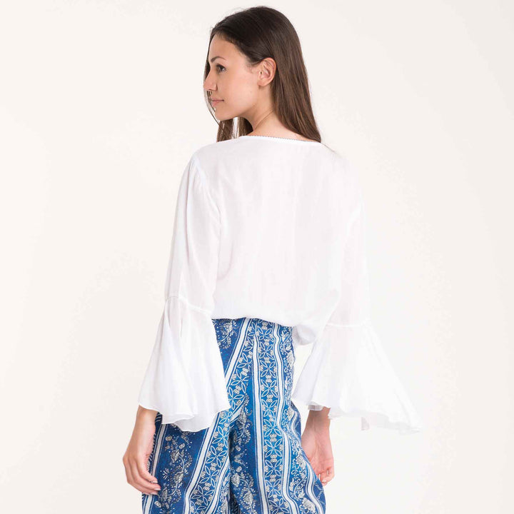 The Selene blouse with V-neck enhances the silhouette with sober elegance. The wide sleeves guarantee comfort and freedom of movement, perfect for warmer days. The ethnic pattern gives character and personality to the garment, making it ideal for those seeking a conscious and refined style. A versatile piece that easily adapts to multiple occasions, from casual to semi-formal.