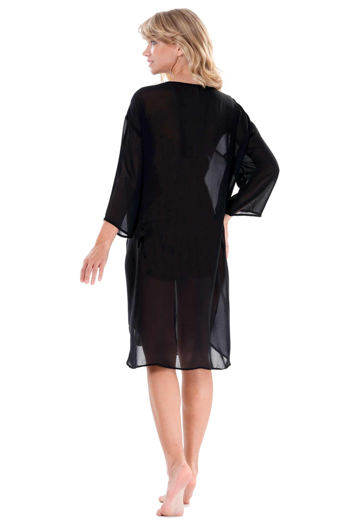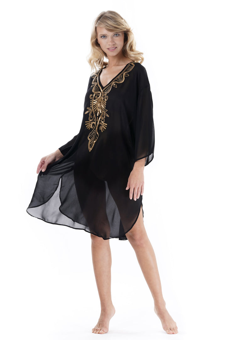 This elegant caftan features refined golden details that enhance its sophisticated design. Perfect for adding a touch of luxury to your beach or evening look, its elegant silhouette offers both comfort and style.