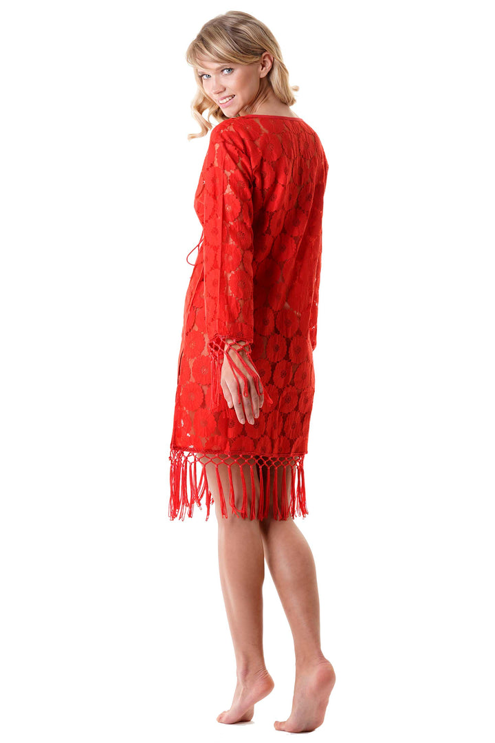 This elegant caftan features a deep V-neckline that enhances its sophisticated silhouette. Delicate floral embroidery adds a refined touch, while the fringes on the hem and sleeves provide gentle movement and texture. Perfect as an elegant cover-up or a casual summer outfit.