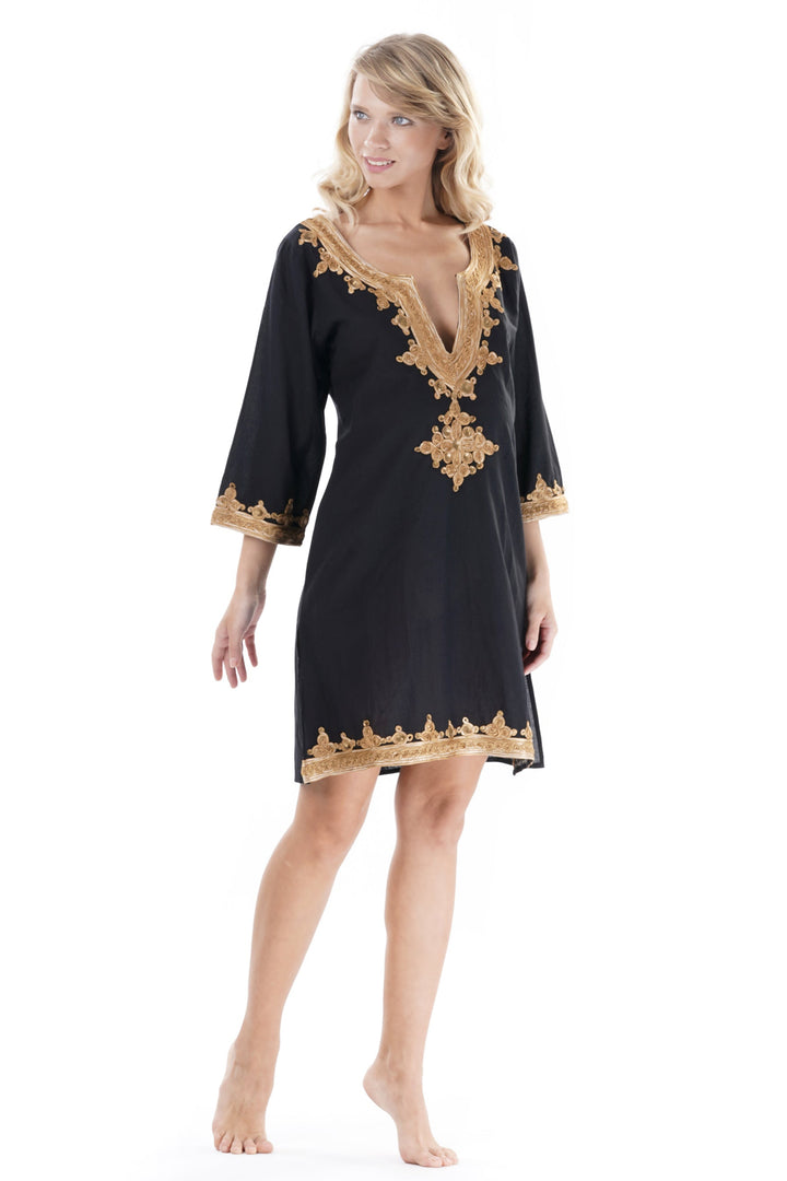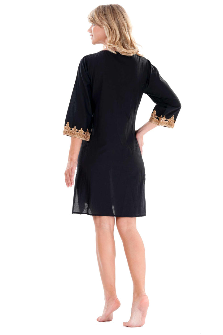 Elegant caftan characterized by refined golden embroideries that enhance every detail. The side slits ensure comfort and freedom of movement, making this garment ideal for sophisticated occasions or stylish moments of relaxation. Carefully crafted for timeless elegance.