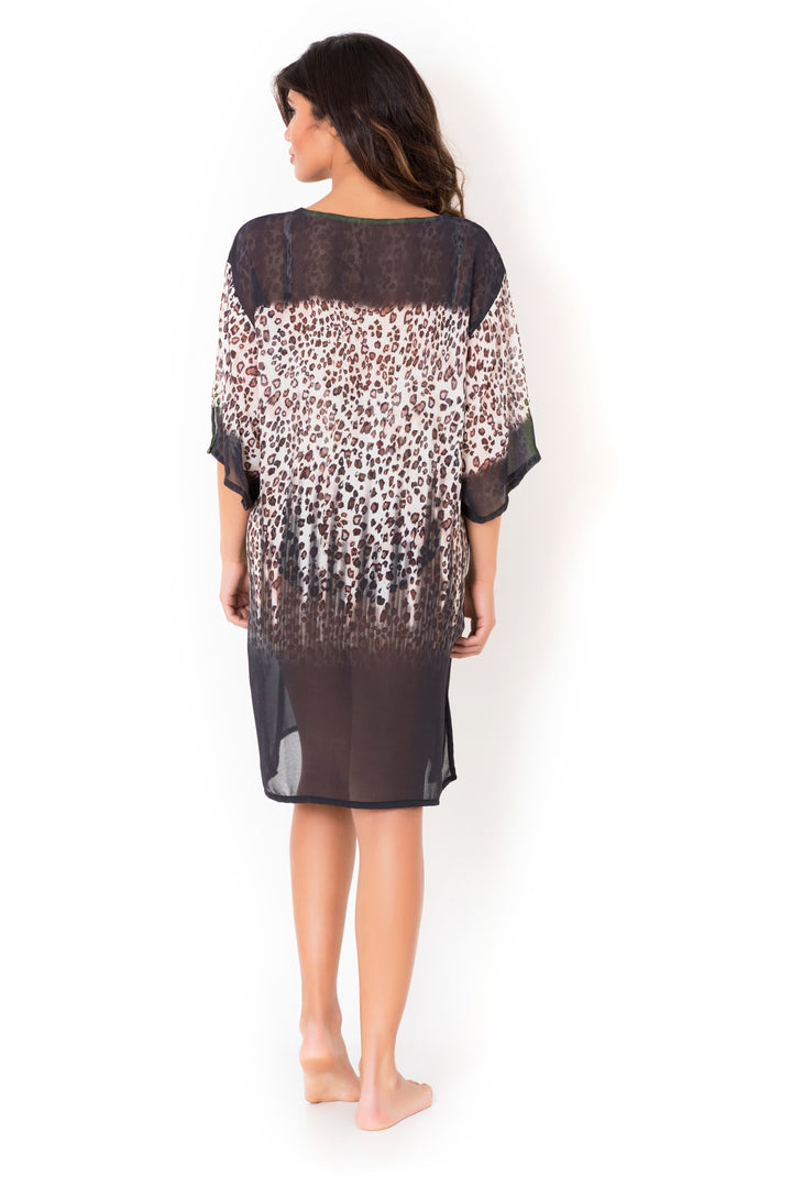 This animal print caftan features a V-neckline that flatters the figure and side slits for greater freedom of movement and an airy silhouette. The lightweight fabric drapes elegantly, making it a sophisticated choice for a fashionable beach look or relaxed summer outings.