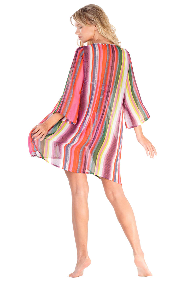 This striped caftan combines style and comfort, perfect for a day at the beach or a summer walk. The tassel tie adds a sophisticated adjustable touch for a personalized fit. Made with lightweight materials, it ensures freshness and freedom of movement. A versatile garment, ideal for enhancing every summer outfit with discreet elegance.