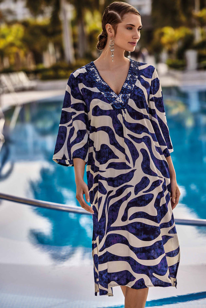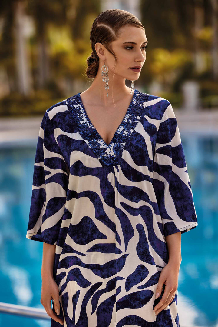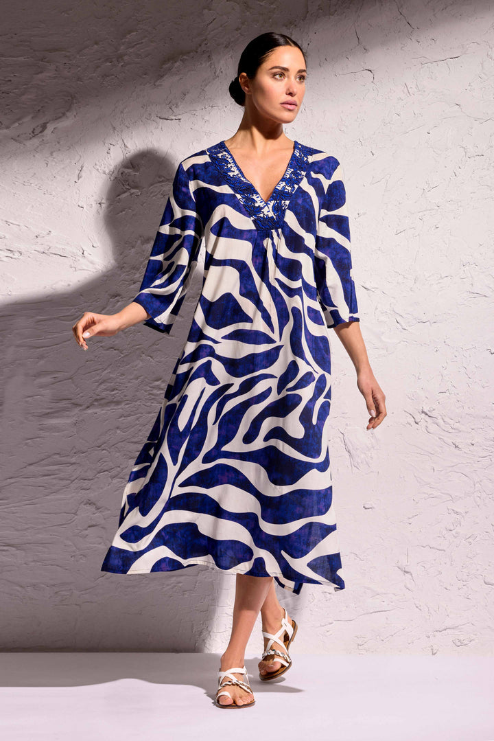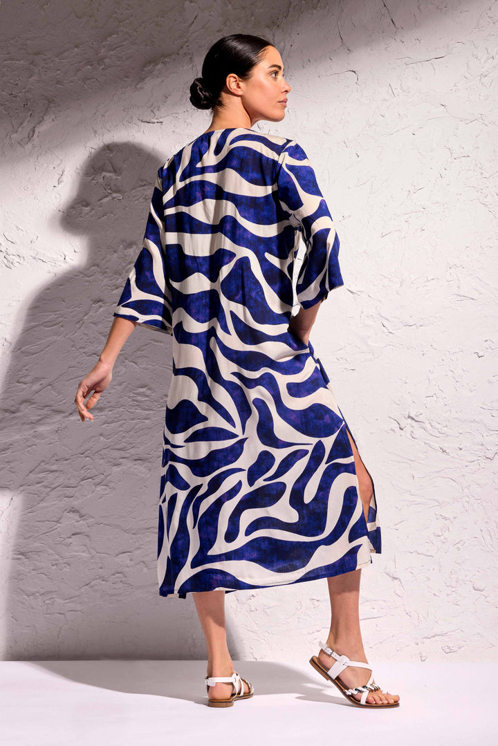 The Exilia kaftan, made of viscose, is a versatile and stylish piece for summer days. The colorful and trendy print makes it perfect for keeping up with fashion. The wide and comfortable design makes it ideal to wear on vacation. With a V-neck and 3/4 sleeves, it is perfect for a fresh and fashionable look.