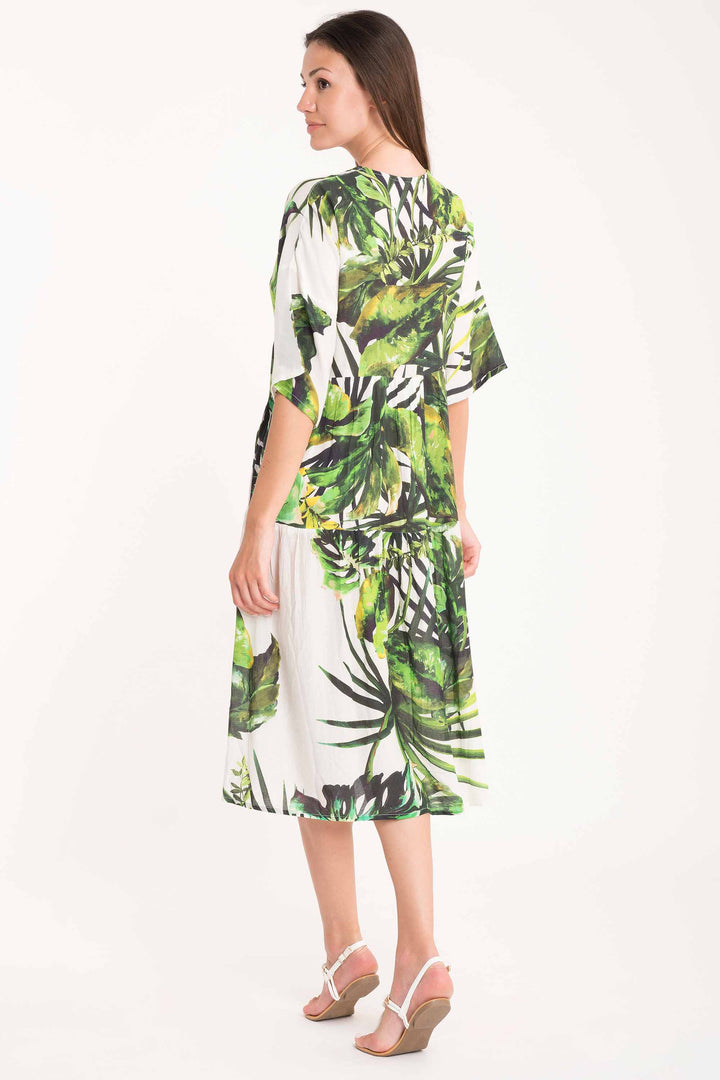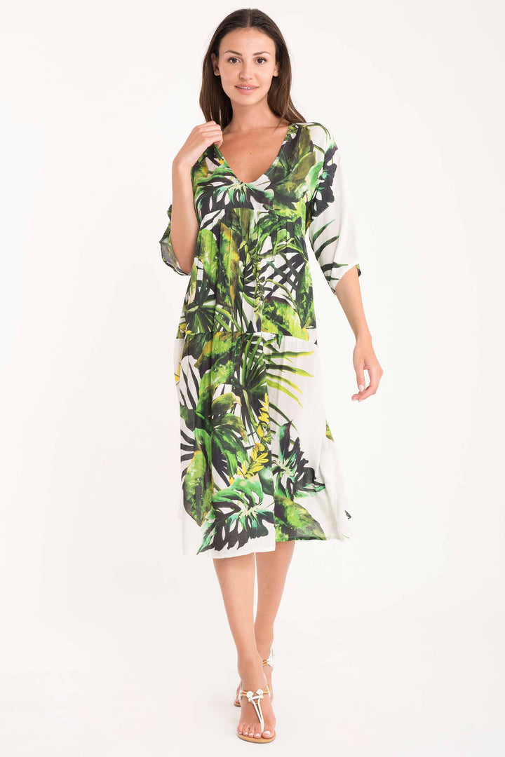 The long tropical caftan features a lively tropical pattern that captures the essence of summer. The loose and comfortable design ensures freedom of movement, perfect for days at the beach or evenings in the city. A versatile garment that suits multiple occasions, from the beach to summer aperitifs, always maintaining a sophisticated and contemporary allure.
