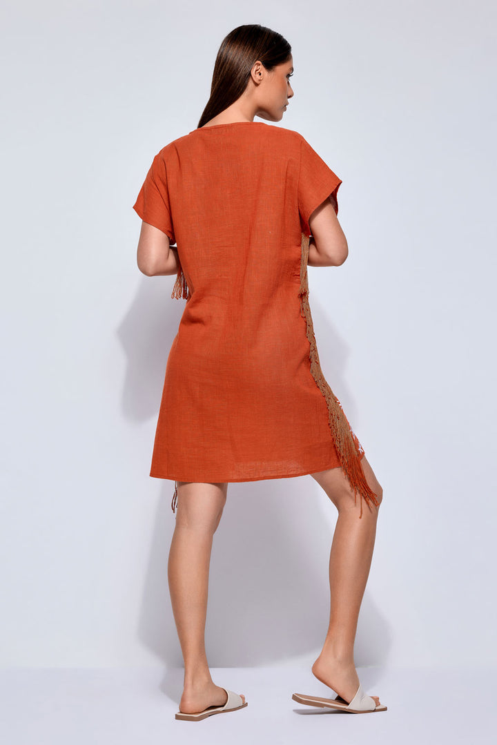 Product Description: The Harmonies linen blend caftan is made of silk and cotton fabric with a flared line that adapts perfectly to every body shape. Its V-neck and short sleeves make this caftan elegant and comfortable. The hand-embroidered floral motifs and side fringes add a touch of sophistication, while the knee length makes it perfect for any occasion.