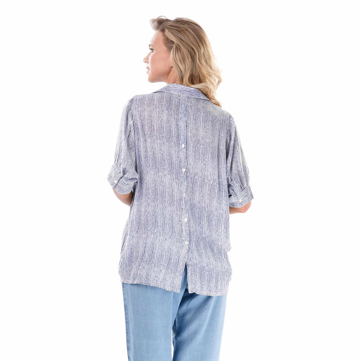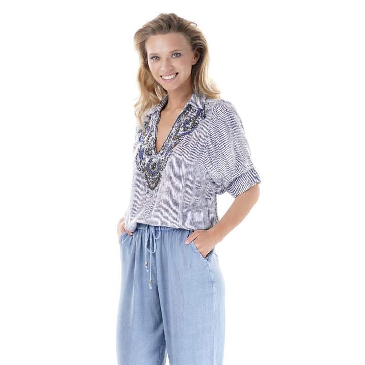 This striped shirt combines an elegant design with refined details. The finely crafted embroidery and beads add a touch of sophistication, making the garment ideal for those seeking a distinctive look carefully crafted in every detail. Perfect for formal occasions or to enrich casual outfits with style.