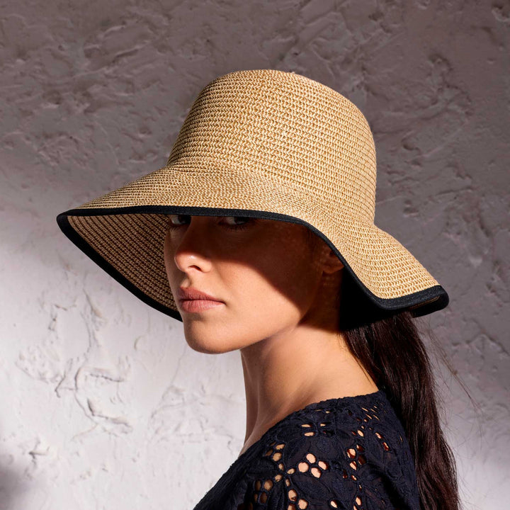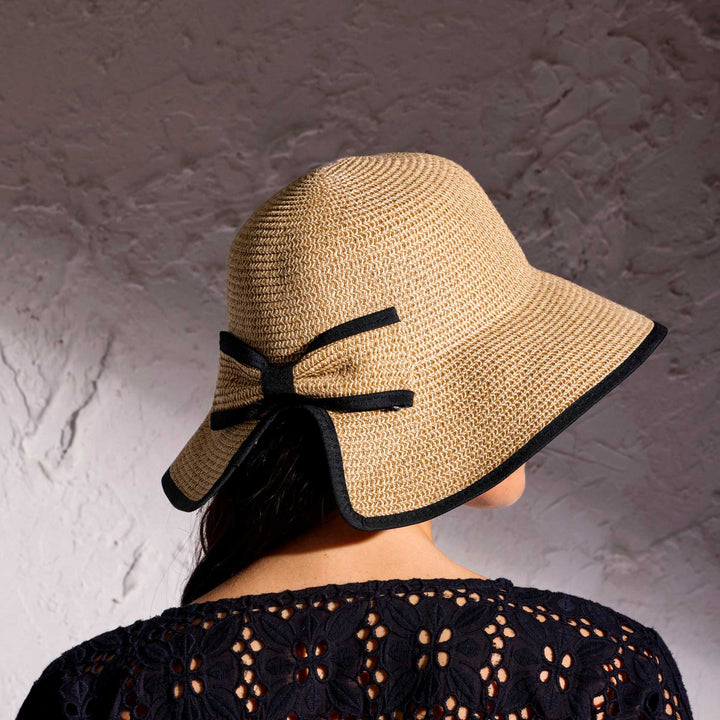 The Margot beach hat is the ideal accessory to protect your face from the summer sun. With a narrow band, an elegant design, and a contrasting black bow, this hat is the perfect complement to your beach outfits or outdoor days. Versatile and chic, the Margot hat is a must-have for summer.