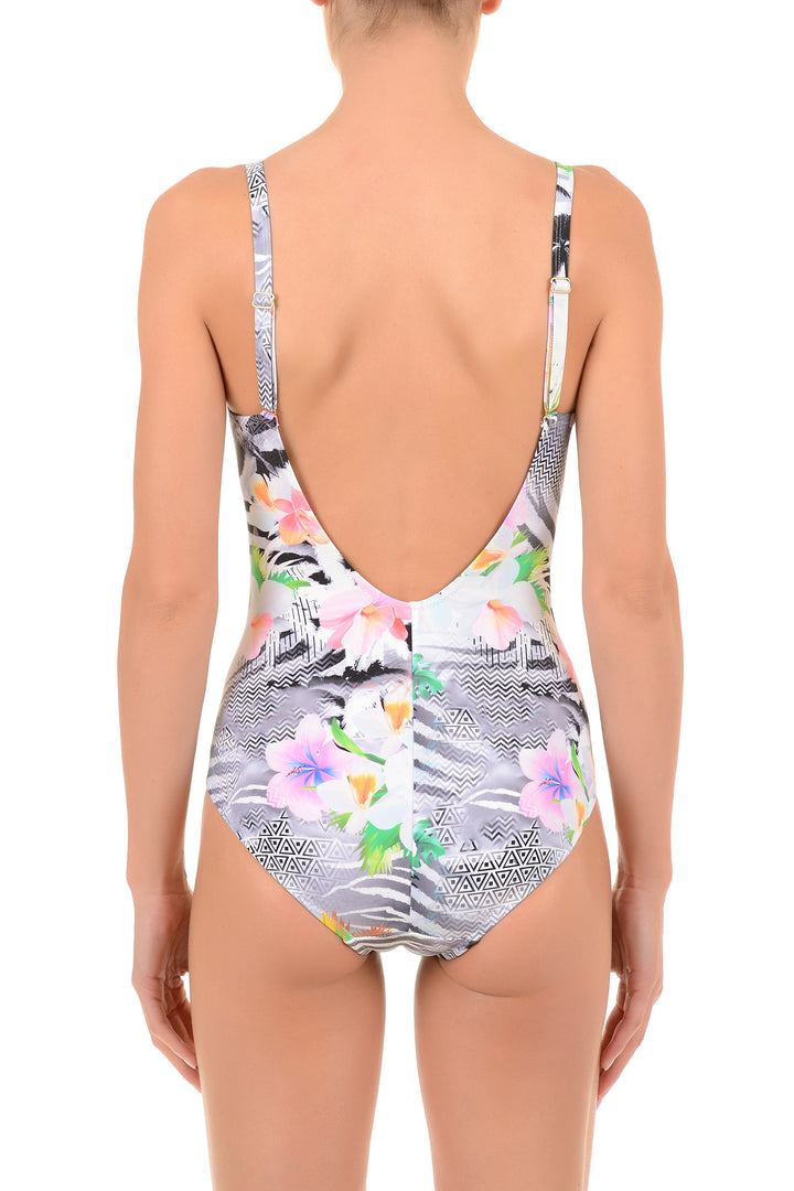 Questo costume intero fantasia combina stile e funzionalità grazie alle spalline regolabili che garantiscono una vestibilità personalizzata. Le coppe removibili offrono supporto modulabile, mentre il tessuto modellante valorizza la silhouette per un comfort ottimale e un look definito. Ideale per chi cerca eleganza senza rinunciare al sostegno.