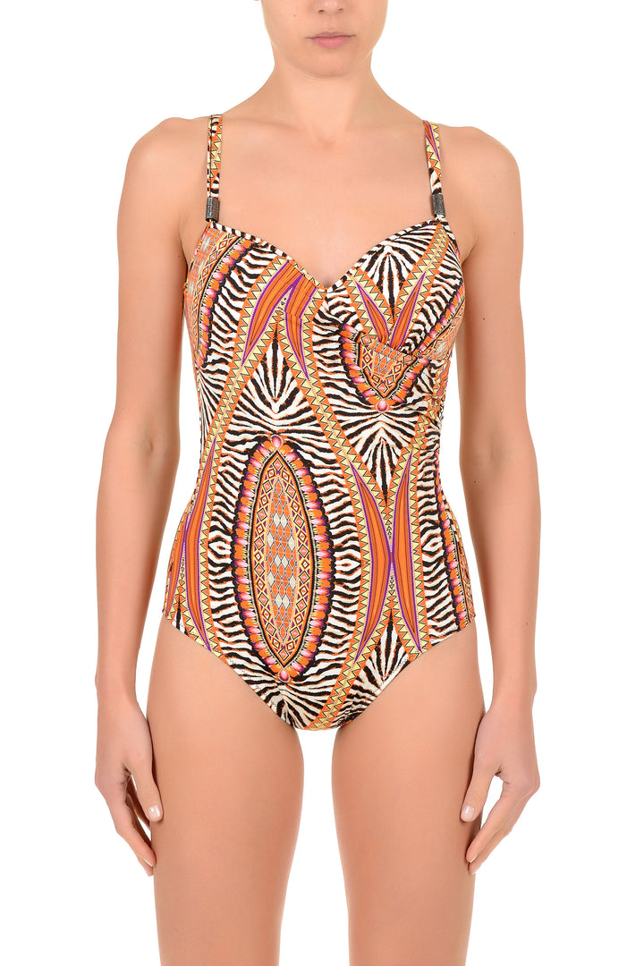 This one-piece swimsuit pattern combines elegance and comfort thanks to the quality fabric and careful design. The lively pattern enhances the silhouette, while the fitted cut ensures support and freedom of movement. Perfect for those looking for a distinctive style and practicality in a single swimwear piece.