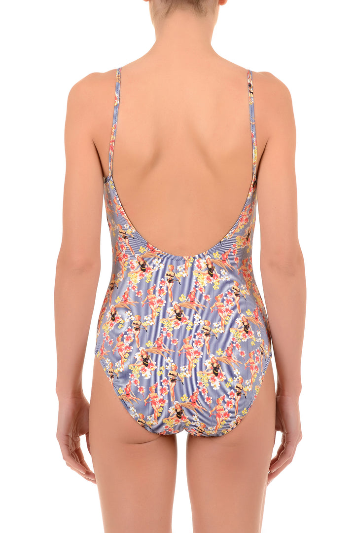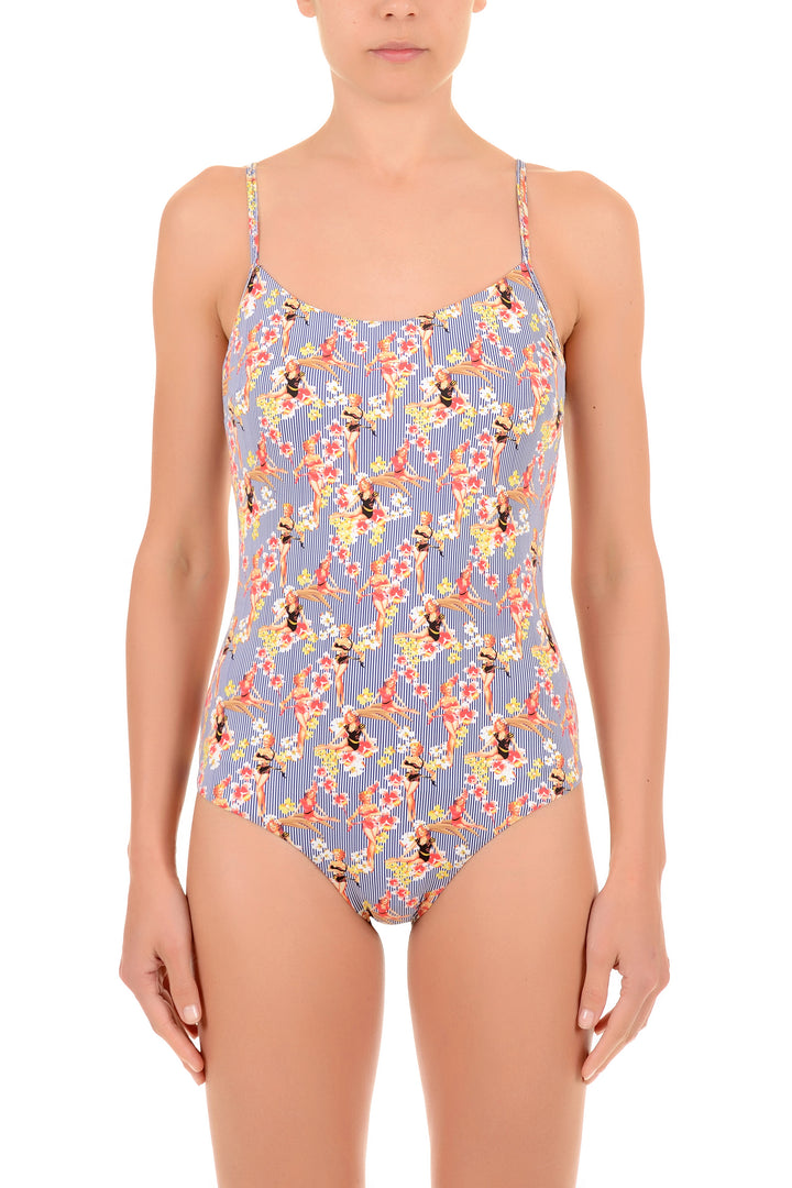 The Hope one-piece swimsuit with a round neckline combines elegance and practicality. The striped and floral pattern creates a dynamic visual effect, perfect for those who want a versatile garment that transitions from the beach to the city. The classic round neckline design ensures comfort and a flattering silhouette, while the floral pattern on a striped base adds movement and personality to your summer wardrobe.