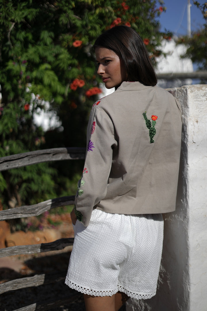 Jacket with handcrafted embroidery. Bohemian-inspired. It stands out for the contrasting embroidery on the front, back, and sleeves. With a Tunisian collar. Long sleeves. Front closure with aged metal buttons and pockets. Its embroidery and floral patterns are the true protagonists of this garment, highlighting the delicate and artisanal craftsmanship that makes it so special. Made of lightweight cotton. With floral lining. It is recommended to take one size larger than usual. The cactus jacket will become the perfect accessory to give your look a bohemian and sophisticated air!