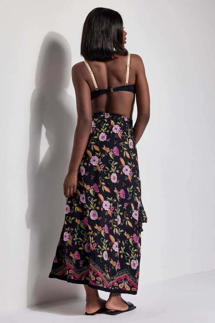Skirt long with pattern fantasy, characterized by an elastic at the waist for a comfortable fit. The central ruffle adds movement, while the lace detail at the bottom gives a touch of elegance. Perfect for a boho-chic and romantic look, ideal for the summer season.