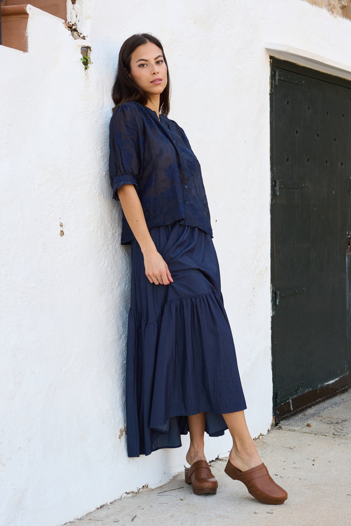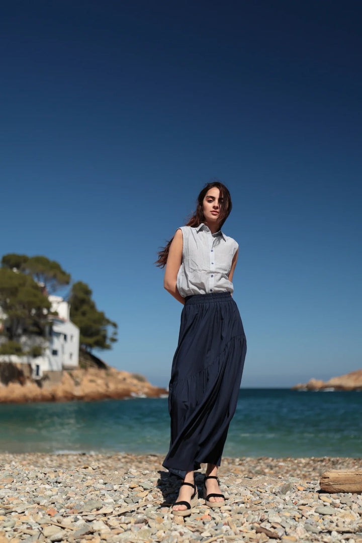 Discover our skirt. Long cut. Made of natural rayon. Its fluid design with a ruffle adds movement and elegance, while the elastic at the waist ensures comfort. A versatile piece you need in your wardrobe!