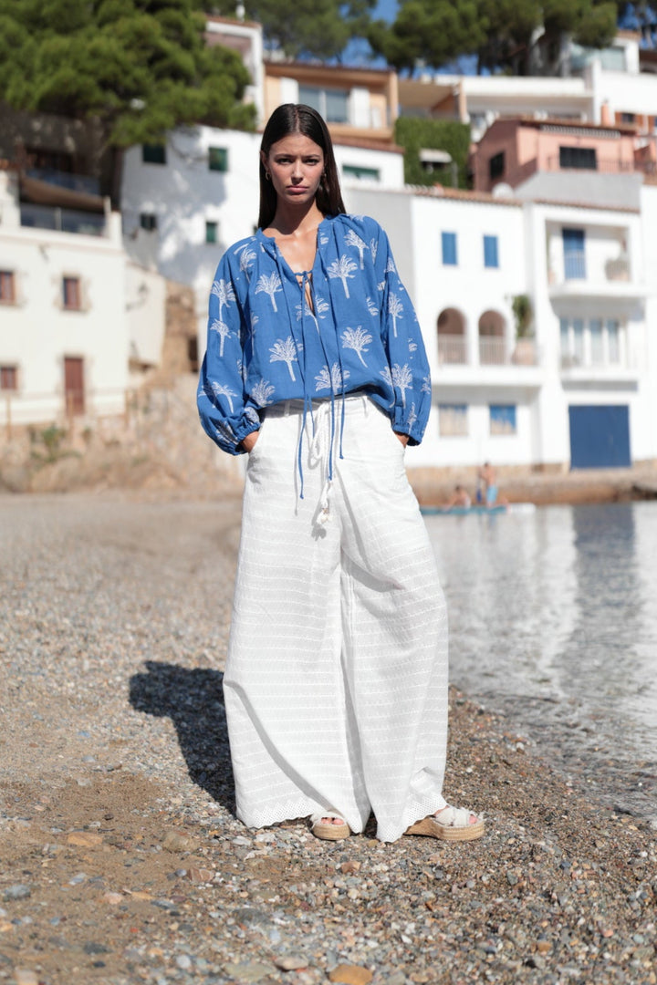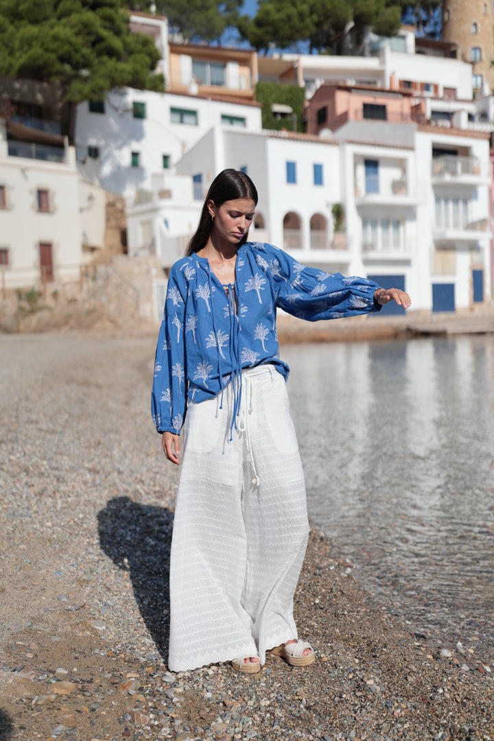 The Sangallo lace pants are the ideal choice for a fresh and sophisticated look. The cotton fabric with delicate openwork embroidery and the elegant white color give them a light and refined appearance. The long cut and wide leg elongate the silhouette and offer comfort. They come with matching ties to fasten them. They are super elegant. Pair them with the blouse from our collection for a flawless look!