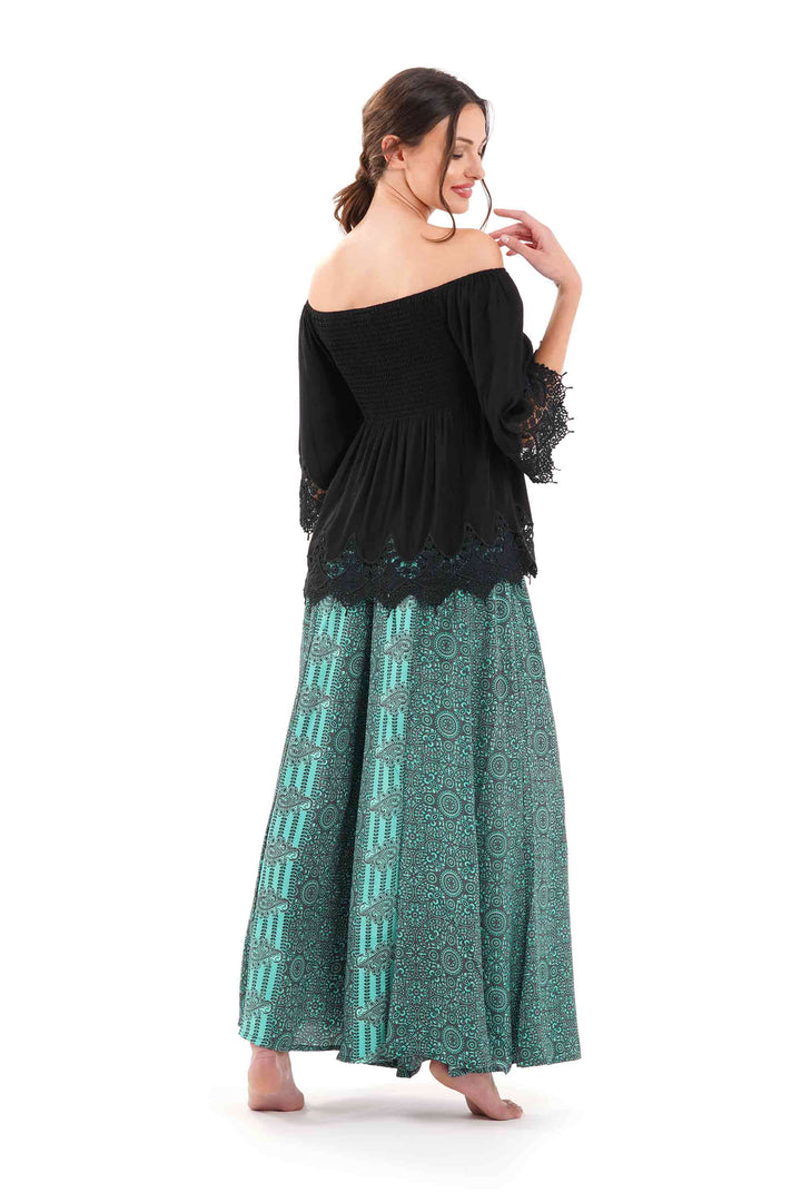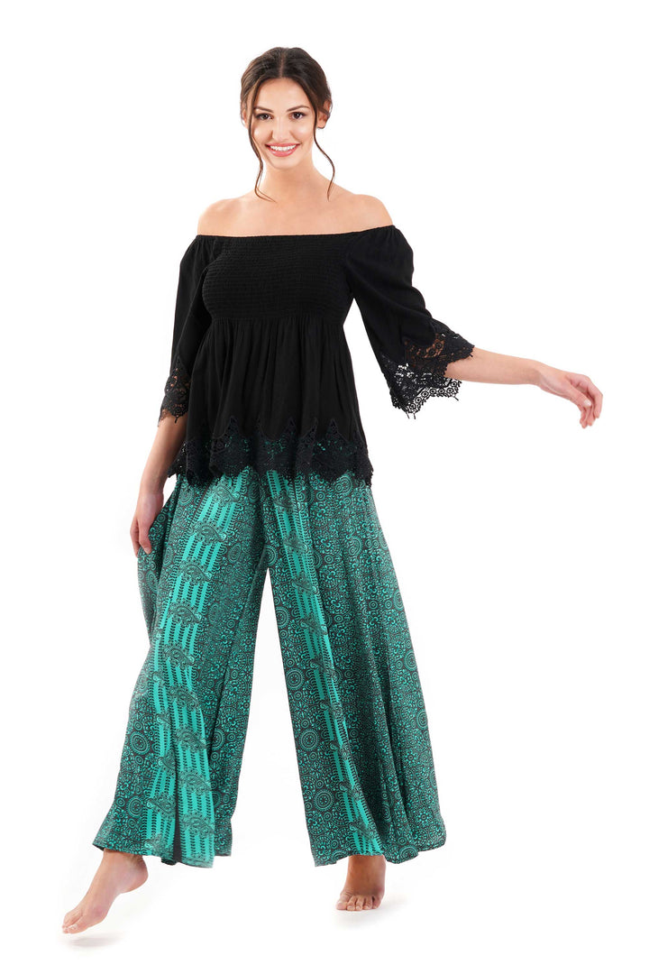 These long pants with a wide and comfortable leg feature a refined ethnic pattern that captures the essence of bohemian style. The generous cut ensures freedom of movement, perfect for those looking for a versatile garment that combines comfort and personality. Ideal for creating sophisticated looks both in casual and more refined contexts, these pants represent a conscious style investment for the contemporary wardrobe.