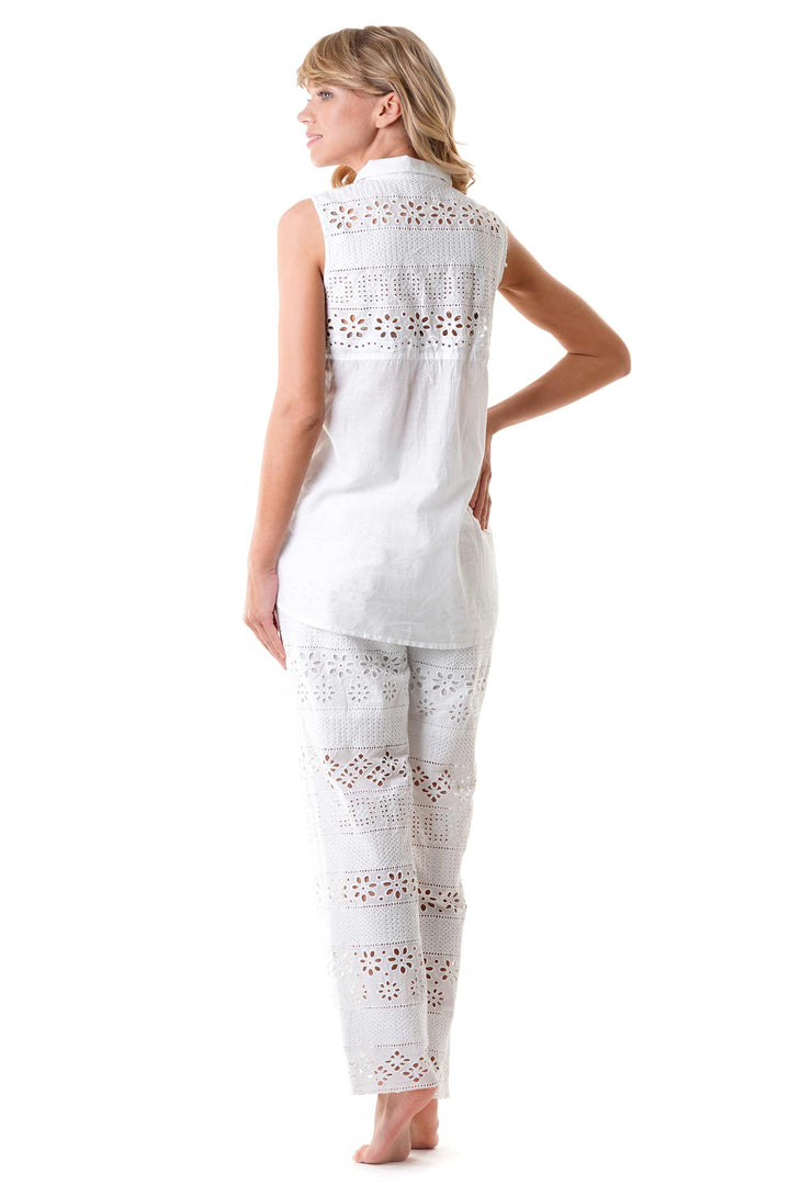 These pants combine elegance and comfort thanks to the refined Sangallo lace details and the pure cotton fabric, which ensures breathability and softness on the skin. Ideal for those looking for a sophisticated style without giving up practicality and freshness, they represent a smart choice for a versatile wardrobe.