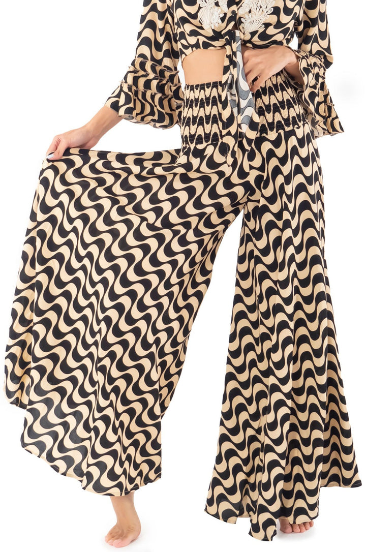 Palazzo pants with a fluid and contemporary silhouette, characterized by a wavy geometric pattern that captures movement and depth. The drawstring at the waist ensures a comfortable and adjustable fit, perfect for those seeking elegance without compromise. A versatile garment suitable for multiple occasions, from day to night, embodying the sophisticated spirit of Mediterranean fashion.
