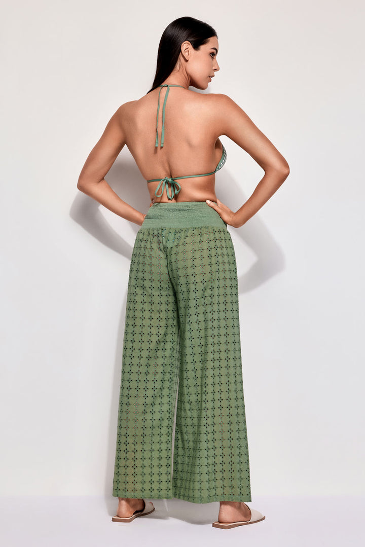 Crafted from pure cotton Sangallo lace, the Saint Tropez Palazzo Pants are a must-have for any wardrobe. Their palazzo shape lends timeless elegance, while the elastic waist ensures a perfect fit. The solid color makes them versatile and suitable for any occasion. An essential addition to your style.