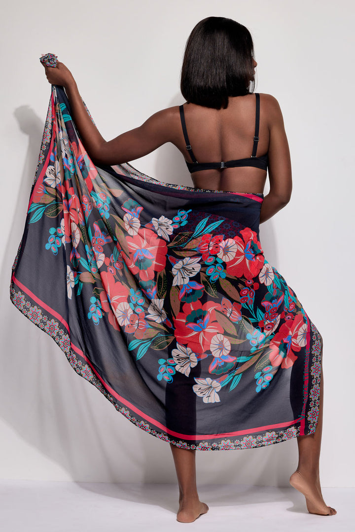 Isla Mujeres Pareo, your essential summer accessory! Lightweight georgette fabric with a fantastic floral pattern. Add a touch of color and style to your beach look. (Not just one, but two uses in one: pareo and shawl!)