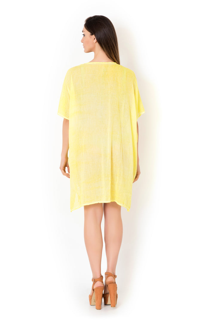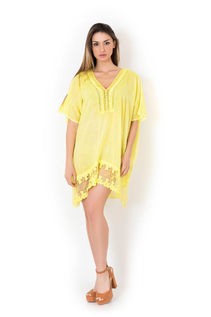 This elegant poncho features a refined V-neckline embellished with delicate embroidery, enhancing its sophisticated charm. Made from soft cotton fabric, it ensures breathability and comfort. The finely perforated hem adds a touch of artisanal detail, making this garment both elegant and versatile for various occasions.