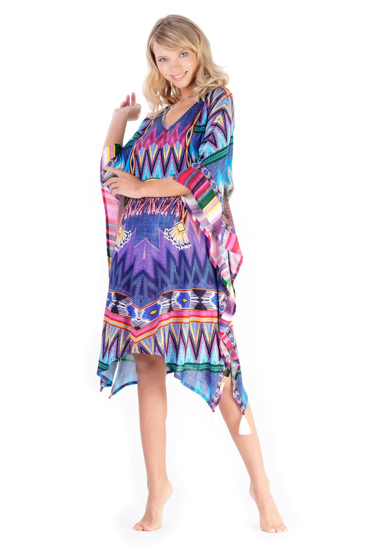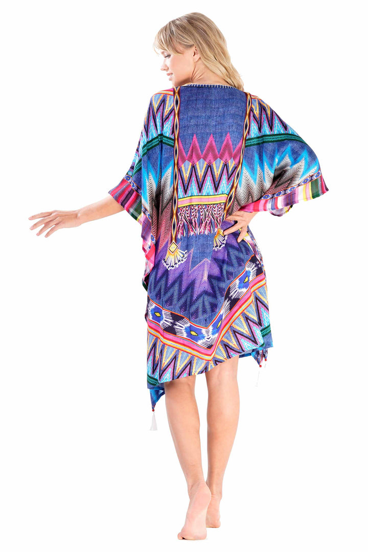 This poncho features a refined V-neckline and a pattern inspired by ethnic motifs that adds a touch of cultural elegance. Its unique design includes tassels on the hem, which provide movement and texture discreetly.