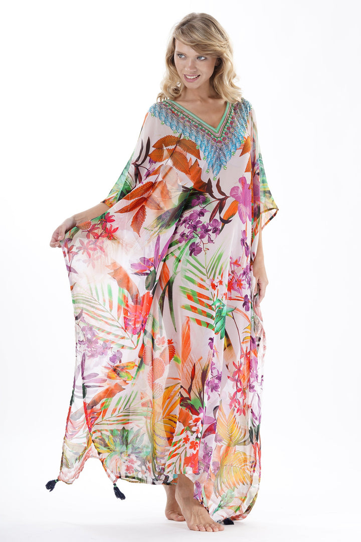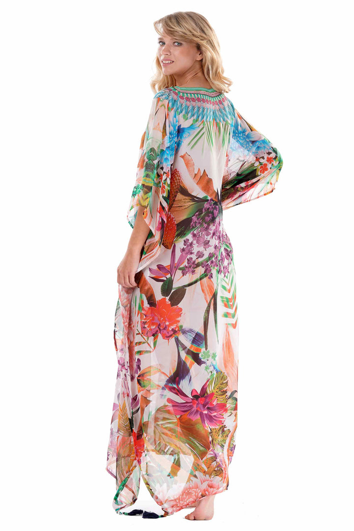 This long poncho features an elegant V-neckline and a delicate floral pattern, perfect for adding a sophisticated touch to your outfit. The fringed hem with tassels enhances movement and style, making it an ideal choice for both casual and more formal occasions. Designed to ensure comfort and a graceful fit, it combines a classic design with refined details.
