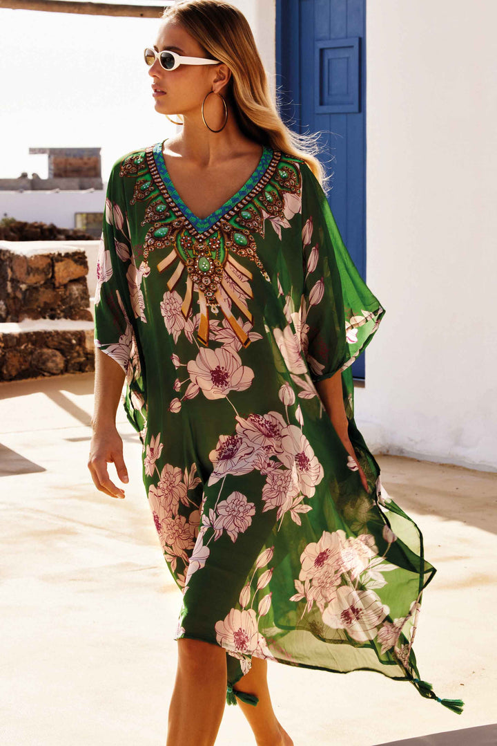 Long poncho with V-neck, enriched with hand-applied rhinestones for a touch of sparkling elegance. The green flora motif adds freshness and naturalness, while the batwing sleeves and side slits guarantee a fluid and comfortable fit. The tassels at the end complete the look with a boho-chic accent, perfect for adding a refined and dynamic touch to any outfit.
