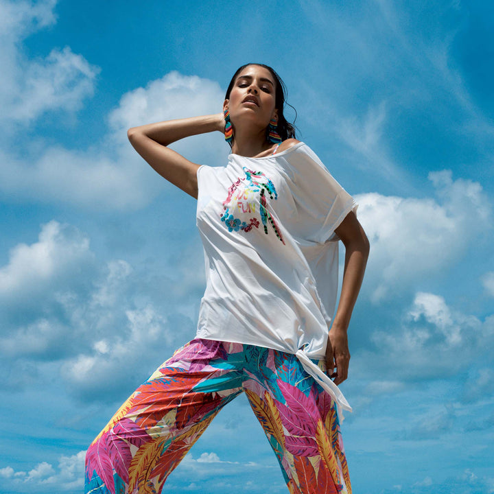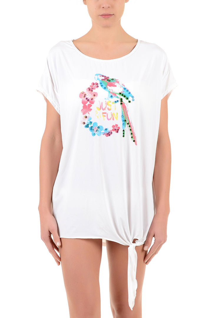 This expertly crafted T-shirt features comfortable half-sleeves and a lively parrot print that adds a touch of tropical elegance to your wardrobe. Perfect for a casual look, it combines style and comfort, making it a versatile choice for everyday outfits.