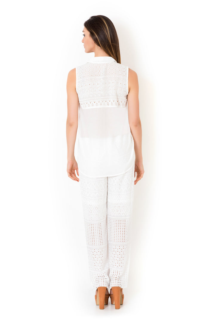 Questo top smanicato presenta un raffinato colletto a camicia ed è realizzato in tessuto di cotone traspirante, garantendo comfort per tutta la giornata. Eleganti dettagli in pizzo Sangallo aggiungono un tocco di sofisticata femminilità, perfetto per valorizzare sia outfit casual che formali.